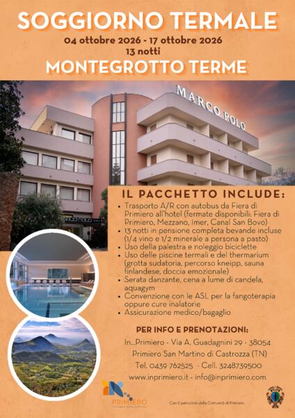 Dal 04 al 17 ottobre 2026 avrà luogo il Soggiorno termale a Montegrotto Terme.
