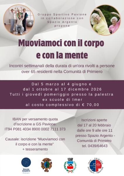"Muoviamoci con il corpo e con la mente" ciclo di incontri settimanali di un'ora per persone con più di 65 anni residenti nella Comunità di Primiero, organizzato da GS Pavione in collaborazione con Spazio Argento e Comune di Imèr.