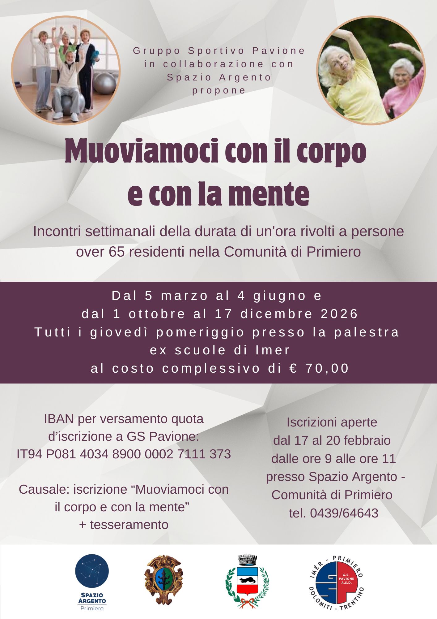 - Ripartono gli incontri settimanali dedicati al movimento Dal 5 marzo al 4 giugno e dal 1 ottobre al 17 dicembre presso la palestre delle ex scuole di Imer. Le iscrizioni sono aperte dal 17 al 20 febbraio presso la sede di Spazio Argento al 1° piano della Comunità di Primiero. Nella locandina tutte le informazioni
