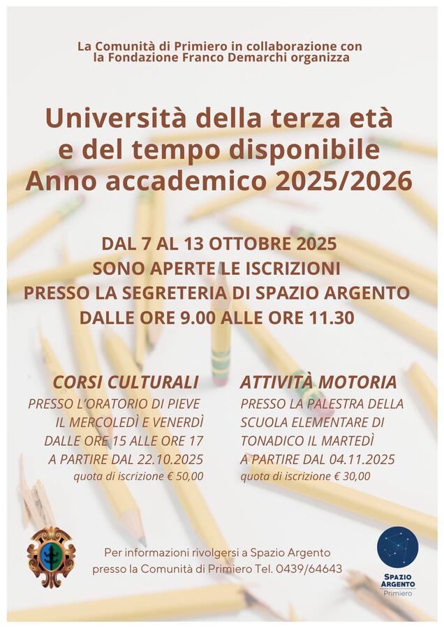 Le lezioni per l'anno accademico 2025/2026 inizieranno il 22 ottobre 2025 e si concluderanno il 27 marzo 2026. Come di consueto le lezioni si svolgeranno il mercoledì e il venerdì dalle ore 15.00 alle ore 17.00 presso l'Oratorio Sacro Cuore in Viale Marconi, 3 - Transacqua.